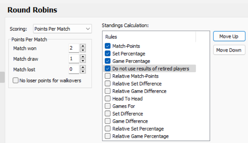 For round robin draws the default setting is not adequate and we suggest you use the following for determining winners. Head-to-head can also be used, but keep in mind it gets tricky when there are 3 players tied. If you used Head to Head, it’s recommended to use it as the 4th tiebreak (after Game Percentage).