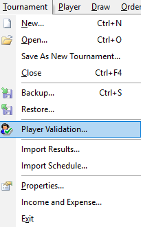 Player validation should be run every time you import new player entries. If you haven’t done so, please do so before seeding players or making draws. You can run player validation by clicking ‘Player Validation’ in the ‘Tournament’ menu. *note* when you run tournament validation it will reset any imported Tournament Entry Rankings. Sometimes it resets to the Championship Race Rankings. If you are making draws or seeding players, you should always re-import the Tournament Entry rankings after you run a ‘Player Validation.’